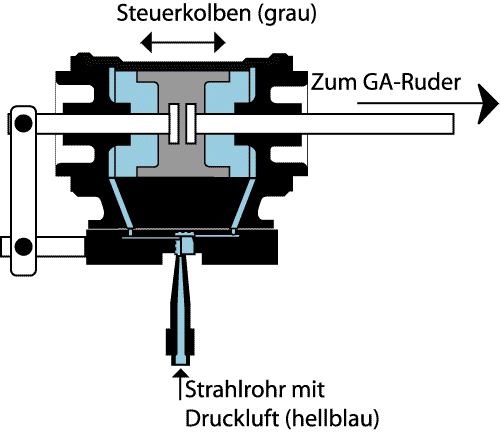seinen Öffnungen der Bewegung des Strahlrohres. Die Bewegung des Steuerkolbens wurde durch ein Steuergestänge auf die GA-Ruder